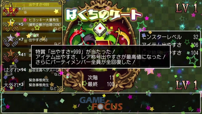 게이트 선택 운이 좋으면, 적을 쓰러뜨릴 때마다 아이템이 드롭되는 피버 상태가! 게이트 운이 나쁘면 몬스터 레벨이 1000을 넘게 되어, 출구를 찾아 헤매는 지옥으로 변하는 경우가 생기기도…!?