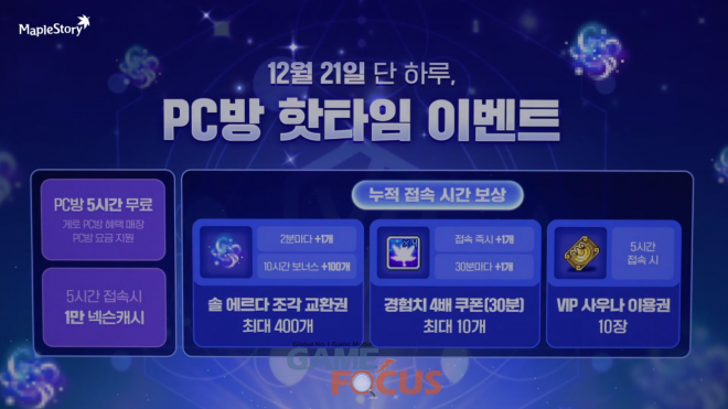 21일에는 역대급 혜택을 제공하는 PC방 이벤트를 진행해 이용자들에게 주목을 받았다. 넥슨은 게토 PC방 혜택 매장에서 '메이플스토리'를 플레이하면 5시간 무료 플레이 혜택을 제공하고, 누적 접속 시간에 따라 최대 1만 넥슨캐시, 솔 에르다 조각 교환권 최대 400개, 경험치 4배 쿠폰(30분) 최대 10개, VIP 사우나 이용권 10장 등을 선물했다.