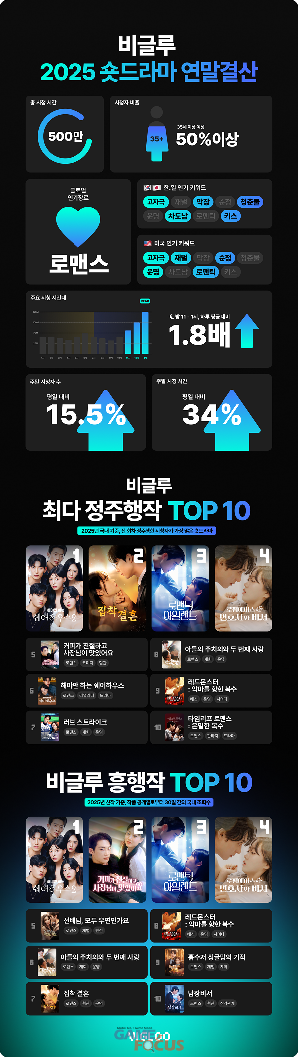2025년 1월 1일부터 12월 31일까지의 집계 결과에 의하면, 올해 비글루 이용자들은 전 세계적으로 총 500만 시간 이상 숏드라마를 시청했다. 핵심 이용자층은 35세 이상 여성으로, 전체 시청의 과반을 차지했다.