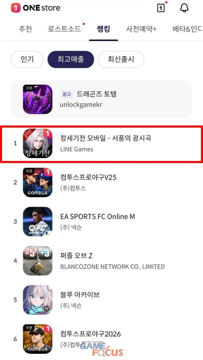 라인게임즈 '창세기전 모바일' 원스토어 매출 순위 1위 달성