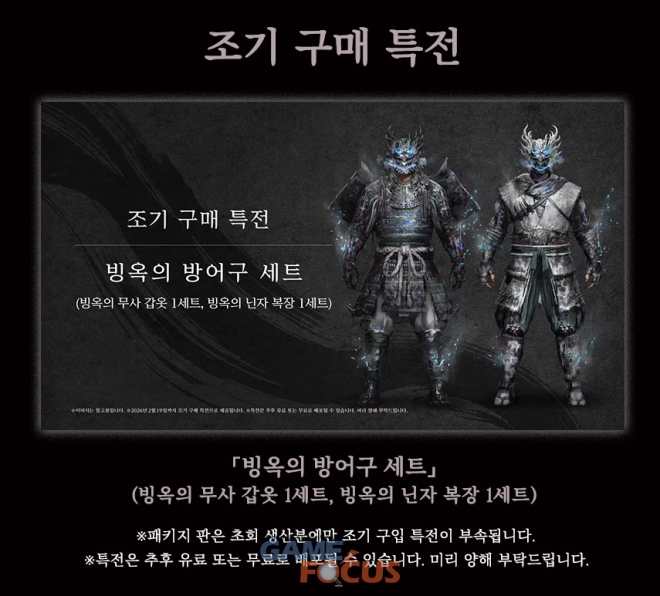 초회 생산분에만 포함되는 조기 구입 특전으로 빙옥의 무사 갑옷 1세트와 빙옥의 닌자 복장 1세트로 이루어진 「빙옥의 방어구 세트」를 다운로드할 수 있는 시리얼이 제공된다.