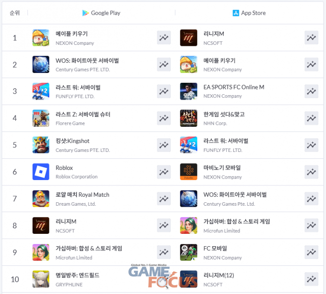 구글 플레이에서는 여러 이슈들 속에서도 '메이플 키우기'가 1위를 수성하고 있다. '화이트아웃 서바이벌', '라스트 워: 서바이벌', '라스트 Z: 서바이벌 슈터', '킹샷' 등이 TOP 5를 형성하고 있다. '로블록스', '로얄매치', '리니지M', '가십하버' 등도 여전히 TOP 10 내에서 순항 중이다.