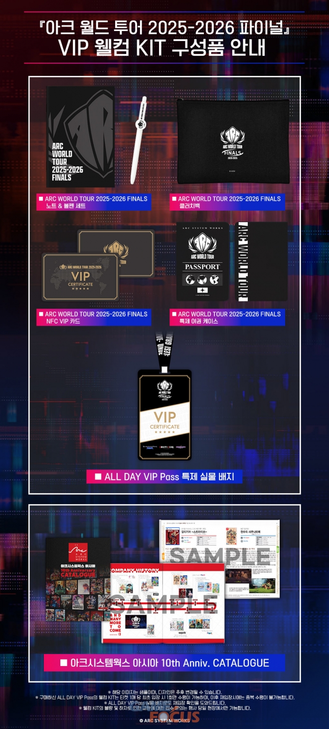 ALL DAY VIP Pass를 구매한 고객에게 전원 증정되는 감사 선물 세트, VIP 웰컴 KIT에는 『아크 월드 투어 2025-2026 파이널』의 첫 대한민국 개최를 기념하여 제작되는 클러치백과 특제 여권 케이스, 노트와 볼펜 세트, 행사 일정과 개요를 손 안의 휴대 전화로도 확인할 수 있는 기능을 탑재한 NFC VIP 카드, 입장 확인 비표로도 사용할 수 있는 특제 실물 배지, 그리고 아크시스템웍스 아시아의 아시아 진출 10주년을 기념하여, 아크시스템웍스 아시아에서 지금까지 출시된 총 180여 타이틀의 게임 소개를 실은 ‘아크시스템웍스 아시아 10th Anniv. CATALOGUE’ 등 풍성한 기념 굿즈들이 포함되어 있다.