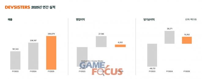 데브시스터즈는 2025년 연간 매출 2,947억 원, 영업이익 62억 원, 당기순이익 154억 원을 기록했다. 매출은 핵심 게임 타이틀인 쿠키런: 킹덤의 연간 수익 성장 및 쿠키런: 브레이버스 카드 게임(이하 쿠키런 카드 게임)의 성공적인 북미 진출에 힘입어 전년 대비 25% 증가했다.