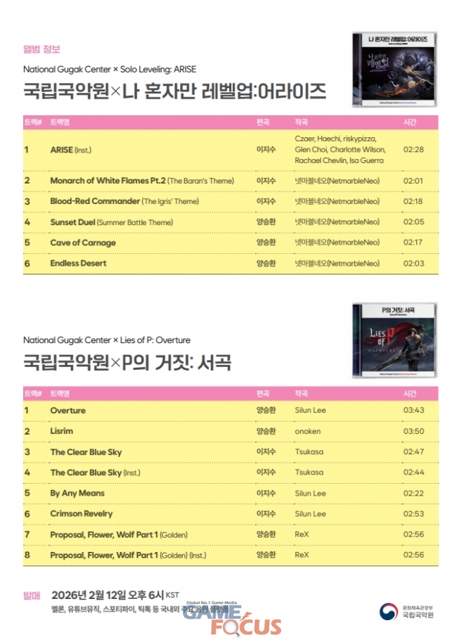 국립국악원 「게임 사운드 시리즈」 앨범 ‘국립국악원 × P의 거짓: 서곡’, ‘국립국악원 × 나 혼자만 레벨업:어라이즈’는 2월 12일(목) 오후 6시(KST), 멜론·유튜브뮤직·스포티파이 등 국내외 주요 음원 플랫폼을 통해 공개된다.