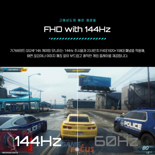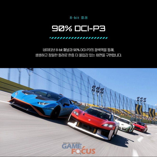 게이머에게 필수적인 기능도 빠짐없이 탑재했다. AMD FreeSync 기술을 지원해 프레임이 불규칙하게 떨어지는 찢어짐 현상을 줄여 주며, 144Hz 고주사율과 결합해 부드러운 화면 스크롤과 조작감을 제공한다. 1500:1의 명암비와 16:9 와이드 비율 평면 패널이 어우러져 몰입감 높은 게임 환경을 구현하며, HDMI 2.0과 DP 1.4 단자를 통해 다양한 게이밍 PC 및 노트북에 손쉽게 연결할 수 있다.