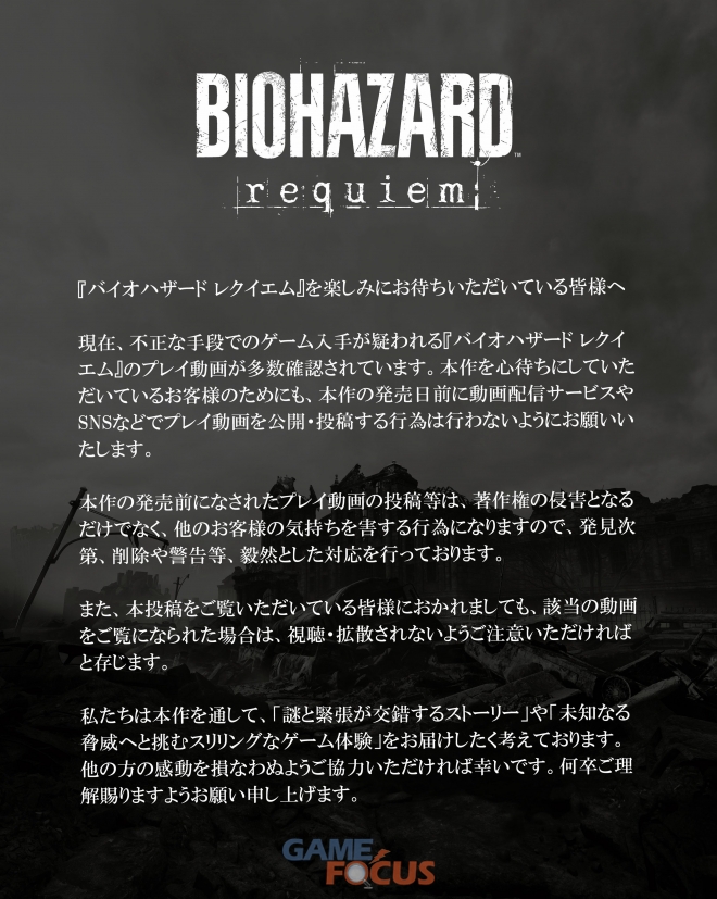 유출 소식이 알려지자 캡콤 역시 지난20일 ‘바이오하자드 레퀴엠을 기다려 주시는 여러분께‘라는 제목의 공지를 통해 발매일 전의 동영상 플랫폼 및 SNS 등을 통해 관련 영상을 유포하거나 공유 기능을 통해 확산시키지 말 것을 요청하는 한편, 관련 행동이 저작권 침해에 해당할 수도 있다고 경고한 바 있다.
