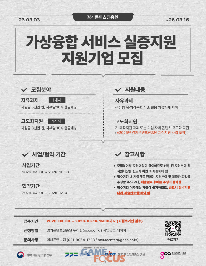 <가상 융합 서비스 실증 지원> 사업은 중·대기업과의 협업을 통한 수요 맞춤형 기술 제작 및 실증(Proof of Concept, PoC)을 지원하는 사업이다. 이번 모집은 생성형 AI와 가상 융합 기술을 활용한 ‘자유과제’와 기존 시장에 출시된 콘텐츠·서비스의 성능을 높이는 ‘고도화 지원’을 대상으로 한다. 중·대기업 협업 모델은 오는 3월 중순 별도로 모집할 예정이다.