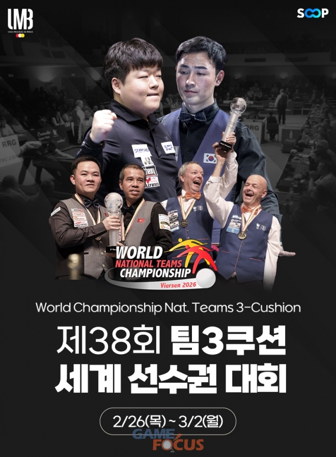 SOOP(각자 대표이사 서수길, 최영우)은 26일(목)부터 3월 2일(월)까지 독일 비어슨에서 열리는 ‘제38회 팀 3쿠션 세계선수권’을 글로벌 포함 전 경기 독점 생중계한다. 이번 대회는 세계캐롬연맹(UMB)이 주최·주관하는 3쿠션 국가대항전이다.