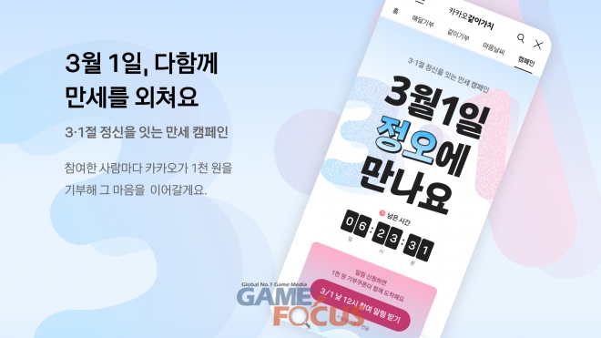 카카오(대표이사 정신아)의 사회공헌 플랫폼 카카오같이가치는 제107주년 삼일절의 의미를 되새기는 ’만세 캠페인’을 오늘 낮 12시부터 오후 6시까지 진행한다고 밝혔다. 이번 캠페인은 삼일절 당일 정오에 맞춰 만세 운동이 일어났던 역사적 의미를 기념하기 위해 정오부터 6시간만 집중적으로 운영하는 것이 특징이다.