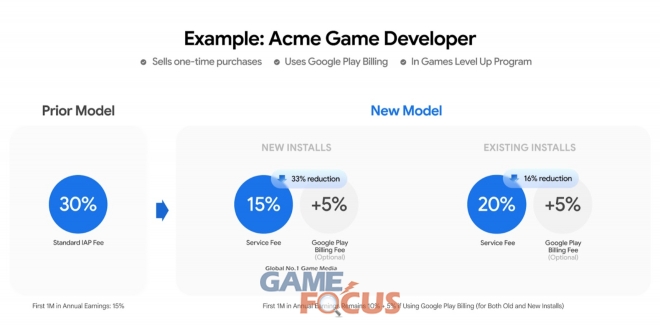 쉽게 설명해 기존 대형 게임을 서비스하는 개발사는 구글과의 수익 분배율이 기존 30%에서 25%(서비스P 20%+구글 결제 수수료5%)로 줄어들게 되며 소규모 베타 앱 개발사는 26%에서 최대 20%(신규 앱 15%)까지 줄일 수 있다. 앱의 종류와 상관 없이 신규 앱의 경우 추가로 5%를 감면받게 될 예정인 만큼 실질적으로 개발자들이 느끼는 체감적 수익률 상승은 클 것으로 전망된다.