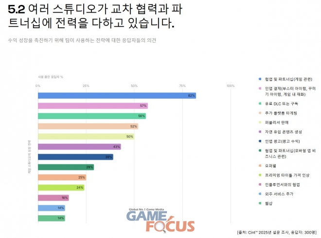 압도적으로 많은 응답자(82%)가 게임 관련 협업 및 파트너십을 활용하고 있으며, 57%는 인앱 결제(부스터 아이템, 꾸미기 아이템, 게임 내 재화)를 활용하고 있다고 답했다. 타겟 도달 범위를 확장하는 것 또한 핵심 전술로, 절반이 넘는 스튜디오(52%)가 추가 플랫폼을 타겟팅하고 있으며 50%는 퍼블리셔 판매를 통해 수익을 창출하고 있다.