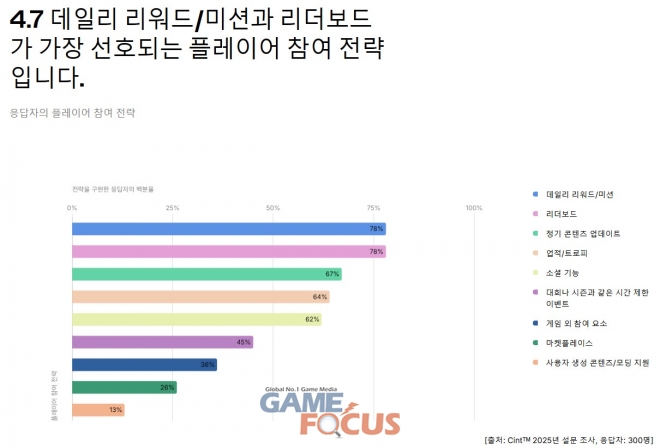 응답자의 83%가 ‘온라인 멀티플레이어 게임’ 구축을 선호하는 것으로 나타났으며, 55%가 게임에서 일반적으로 2~9명의 사용자를 지원한다고 답변했다. 많은 스튜디오가 크로스플레이 기능(72%)을 우선적으로 고려하고, 데일리 리워드 및 미션과 리더보드(각각 78%)를 구현했다고 밝혔다.