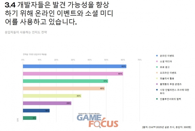 많은 스튜디오들이 주로 디지털 방식을 통해 관심과 화제성을 확보하고 있으며, 게임을 홍보하는 데 온라인 이벤트(62%)와 소셜 미디어(60%)를 활용하는 경향이 두드러졌다.