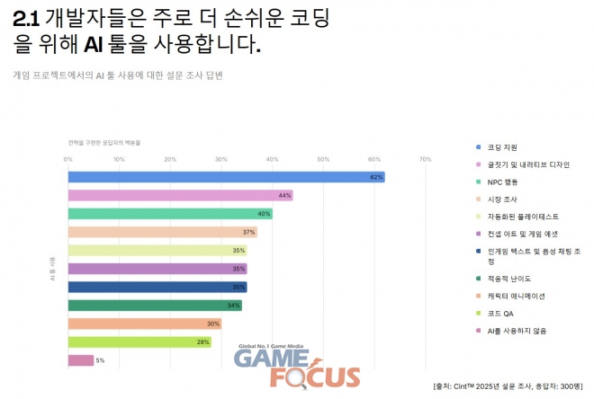 스튜디오는 주로 백엔드 개발 및 계획 업무에 AI 툴을 활용합니다. 응답자의 95%가 이미 업무에 AI를 활용하고 있으며, 주요 활용 분야로는 코딩 지원(62%)과 글짓기 및 내러티브 디자인(44%)이 꼽혔다.