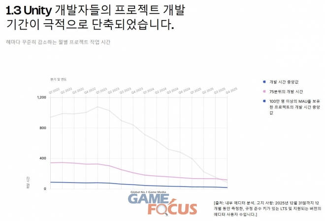 유니티 프로젝트 개발 시간 또한 전반적으로 크게 감소했다. 개발 시간 중앙 값이 2022년 1월 91시간에서 2025년 12월 21시간으로 77% 감소했으며, 플레이어 수가 가장 많은(MAU 100만 명 이상) 유니티 프로젝트의 개발 시간 중앙값 역시 2023년 3월 462시간에서 2025년 10월 86시간으로 크게 감소했다.