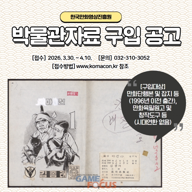 문화체육관광부(장관 최휘영)와 한국만화영상진흥원(원장 백종훈, 이하 진흥원)은 우리 만화 문화의 역사적·문화적 가치를 지닌 만화자료를 수집·보전하여 후세에 전승하기 위해 고만화 박물관자료 공개 구입을 진행한다.