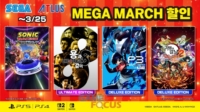세가퍼블리싱코리아(대표 사이토 고)는 PlayStation™Store 및 닌텐도 e숍에서 판매 중인 일부 PlayStation®5/PlayStation®4/Nintendo Switch™/Nintendo Switch™ 2용 타이틀을 기간 한정으로 특별 가격에 판매하는 'MEGA MARCH 할인'을 개최 중이라고 밝혔다.