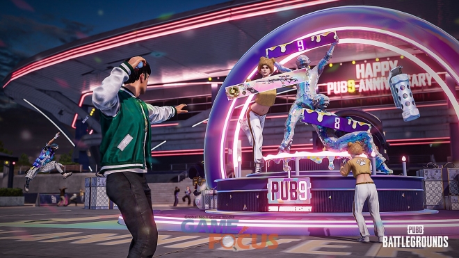 출시 9주년을 맞아 배틀그라운드 전장이 축제로 물들었다. 이용자들이 전장에서 기념 분위기를 느낄 수 있도록 시작섬에 9주년 기념 동상이 세워졌다. 매치 시작 전 동상을 향해 홀로그램 섬광탄을 던져 9번 명중시키면 동상이 해당 이용자의 모습으로 변한다. 전장의 하늘에는 9주년을 기념하는 드론쇼가 펼쳐지며 축제 분위기를 더한다. 또한 배틀그라운드 최초로 접속만 해도 무료로 획득 가능한 ‘이벤트 패스: 올 데이 파티’가 제공되며, 미션 달성을 통해 ‘올데이 프로젝트’ 아이템과 이모트, 지코인(G-Coin), BP 등 다양한 보상을 얻을 수 있다.