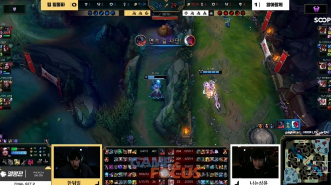 1세트는 아우렐리온 솔을 기용해 변수를 만드려고 한 팀 릴동파와 바텀 라인을 중심으로 한 알아할게의 치고 받는 난투가 이어졌다. 팀 릴동파는 상대적인 벤픽의 우위를 앞세워 경기를 전체를 유리하게 가져가갔지만 개개인의 실수를 놓치지 않은 알아할게가 이득을 챙겨 나가며 팽팽한 접전 상황을 유지했다.