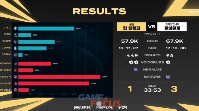 승부는 두 번째 바론 타이밍을 앞두고 벌어진 한타에서 결정됐다. 정글과 미드의 존재감 차이를 보여주며 한타에서 대승한 알아할게는 한타에서 승리하고 바론을 바로 차지한 이후 그대로 상대 넥서스를 밀어내며 1세트 승리의 주인공이 됐다.