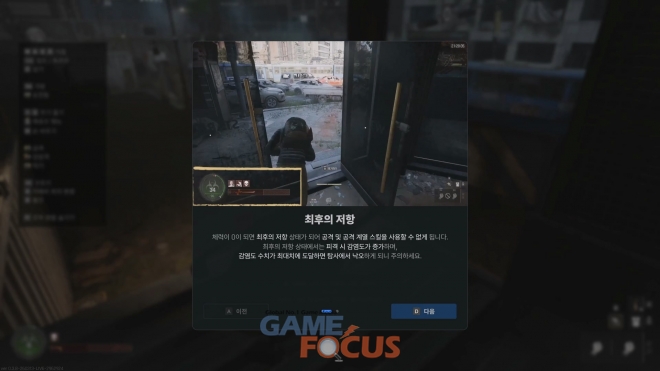 진입장벽 완화 측면에서 이번 테스트에서 돋보였던 요소는 ‘최후의 저항’ 시스템을 들 수 있다. 이 시스템을 통해 체력이 모두 소진되어도 즉시 죽지 않고 감염도가 한계치에 도달하기 전까지 탈출을 시도할 수 있는 기회를 제공한다. 이는 익스트랙션 장르에 익숙하지 않은 초보 유저들에게는 실패의 두려움을 줄여주는 완충제 역할을 한다.