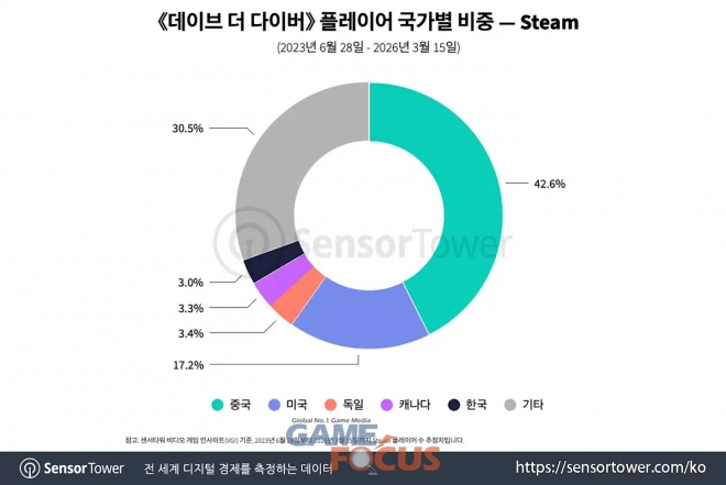 Steam 기준 국가별 플레이어 비중을 보면 중국이 약 43%로 가장 높은 비중을 차지하며, 미국, 독일, 캐나다, 한국을 크게 앞서는 것으로 나타났다. 이러한 비중은 공식 출시 이전부터 존재하던 중국 유저 수요가 반영된 결과일 가능성이 있으며, 공식 출시 이후에는 해당 수요가 보다 본격적으로 확장되며 성과 상승으로 이어진 것으로 해석된다.