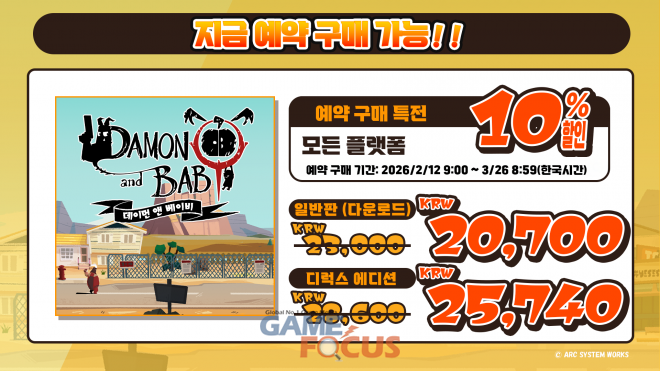 아크시스템웍스아시아 주식회사는 2026년 3월 26일 (목) 출시 예정인 Nintendo Switch™, PlayStation®5, PlayStation®4, Steam®용 탑뷰 건 액션 어드벤처 『데이먼 앤 베이비 (DAMON and BABY)』의 체험판이 오늘(19일)부터 배포 시작되었다고 밝혔다. 이번 작품은 마왕 ‘데이먼’이 ‘신비로운 아이’를 데리고 저주를 풀기 위한 모험에 나서는, 탑뷰 건 액션 어드벤처 게임이다.