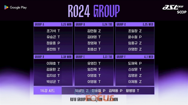24강 조편성을 통해 다양한 대결 구도가 형성됐다. 먼저 3월 23일(월) 오후 7시 열리는 A조 경기에는 조기석(T), 유승곤(T), 정윤종(P), 윤찬희(T)가 출전하며, 오랜만에 ASL 무대에 복귀한 정윤종이 테란 선수들 사이에서 어떤 경기력을 보여줄지 관심이 모인다. 이어 24일(화) B조에서는 김민철(Z), 김태영(T), 정영재(T), 최호선(T)이 맞붙는다. ‘철벽’ 김민철을 상대로 세 명의 테란이 어떤 전략을 들고 나올지가 주요 관전 포인트다. 25일(수) C조는 조일장(Z), 윤수철(P), 임홍규(Z), 이영한(Z)이 출전한다. 유일한 프로토스 윤수철의 생존 여부가 관심사다.