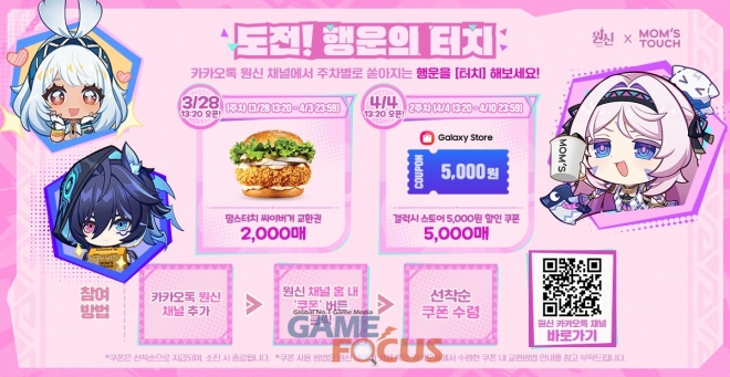 뿐만 아니라 카카오톡 ‘원신’ 채널을 추가하고, 채널 홈 내 ‘쿠폰’ 버튼을 클릭하면 3월 28일부터 4월 3일까지 맘스터치 싸이버거 교환권 2,000매를, 4월 4일부터 4월 10일까지는 갤럭시 스토어 5천 원 할인 쿠폰 5,000매가 선착순 제공된다.