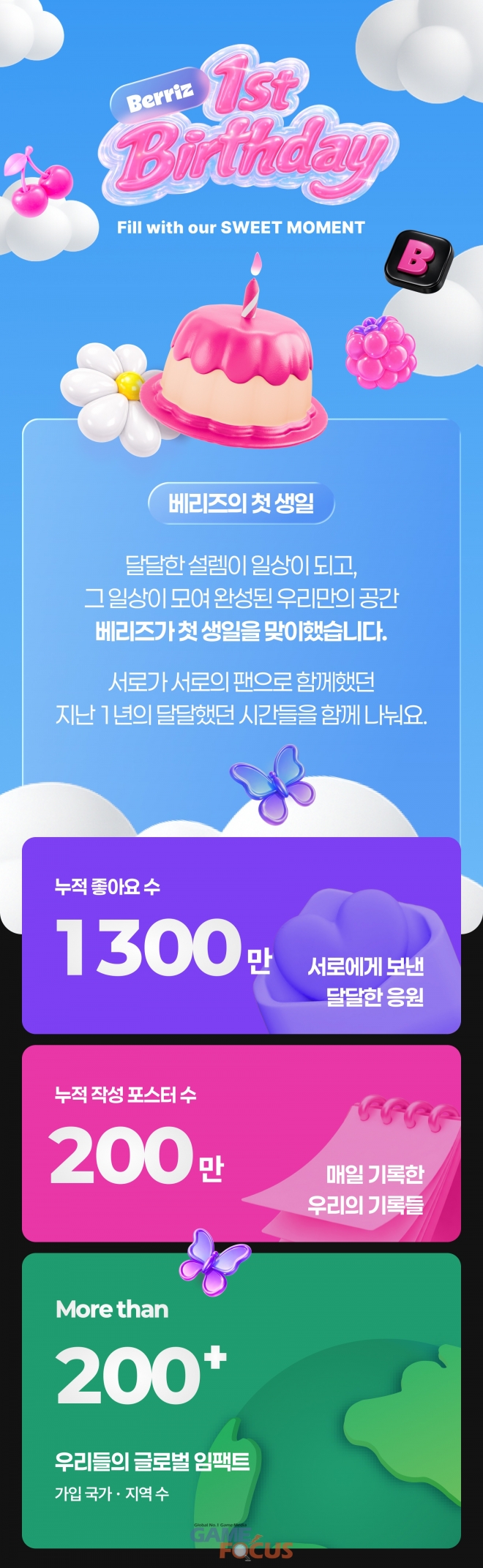 베리즈는 크기와 모양은 다르지만, 모일수록 더 크고 달콤해지는 베리들처럼 장르와 영역을 넘어 K컬처를 사랑하는 전세계 팬덤이 함께 소통하며 즐거움을 더해가는 놀이공간으로 자리매김하겠다고 밝혔던 바. 아이유(IU), 아이브(IVE), 아이들(i-dle) 등 다양한 K팝 아티스트들은 물론, ‘핑계고’, ‘우리들의 발라드’ 등 다양한 콘텐츠IP들의 커뮤니티와 팬 스토어 등 차별화된 서비스로 IP의 즐거움을 확장하며 주목을 받고 있다. 베리즈에서 지난 1년간 진행한 라이브에 쏟아진 누적 응원수는 총 6000만건, 평균 1초에 2번씩 전세계 팬들의 응원이 이어진 셈이다. 글로벌 팬들이 참여한 누적 좋아요 수는 1,300만 건, 누적 작성 포스팅 수는 200만 건을 기록하며 활발한 소통을 이어갔다.