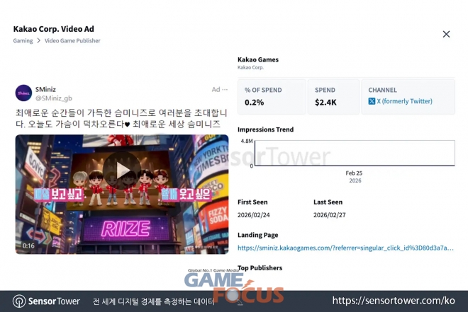 채널별 노출 수를 보면, 일반적인 한국 게임 광고가 Instagram, YouTube, 모바일 앱 중심으로 집행되는 것과 달리, '슴미니즈'는 Instagram과 함께 X에서 높은 노출 비중을 확보한 것이 특징이다. 특히 X는 전체 노출에서 가장 높은 비중을 차지하며(52%), 카카오게임즈가 국내 게임 광고주 중 노출 수 1위를 기록하는 데 핵심적인 역할을 한 채널로 나타났다. 이는 K팝 팬덤이 활발한 소셜 플랫폼 중 하나인 X의 영향력을 반영한 전략으로 해석된다.