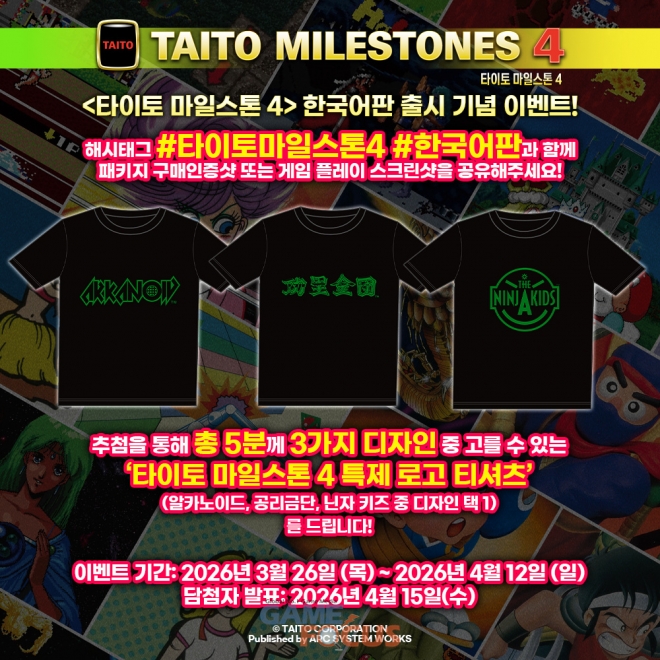 「타이토 마일스톤 4」 한국어판의 출시를 기념하여, 『알카노이드 (ARKANOID)』, 『공리금단 (KURI KINTON)』, 그리고 『닌자 키즈 (THE NINJA KIDS)』의 로고로 디자인된 ‘특제 로고 티셔츠’ 중 선택한 1종을 추첨을 통해 증정하는 SNS 참여 이벤트가 오늘부터 진행된다. 이벤트에 대한 자세한 내용은 다음과 같다.