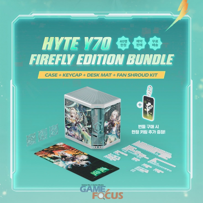 패키지의 핵심 구성품인 하이트 Y70은 전면과 측면에 기둥이 없는 파노라마 구조의 강화유리 패널을 적용해 시스템 내부 개방감을 높인 PC 케이스다. 붕괴 스타레일 콜라보레이션이 적용된 파이어플라이 에디션은 케이스 외부 패널과 강화유리에 캐릭터 일러스트 및 전용 색상 테마가 인쇄되었다. 함께 제공되는 전용 키캡과 데스크 매트 그리고 쿨링팬 규격에 맞춰 장착할 수 있는 팬 슈라우드 킷 역시 동일한 캐릭터 테마로 디자인되어 일체감 있는 시스템 외형 구성을 지원한다.