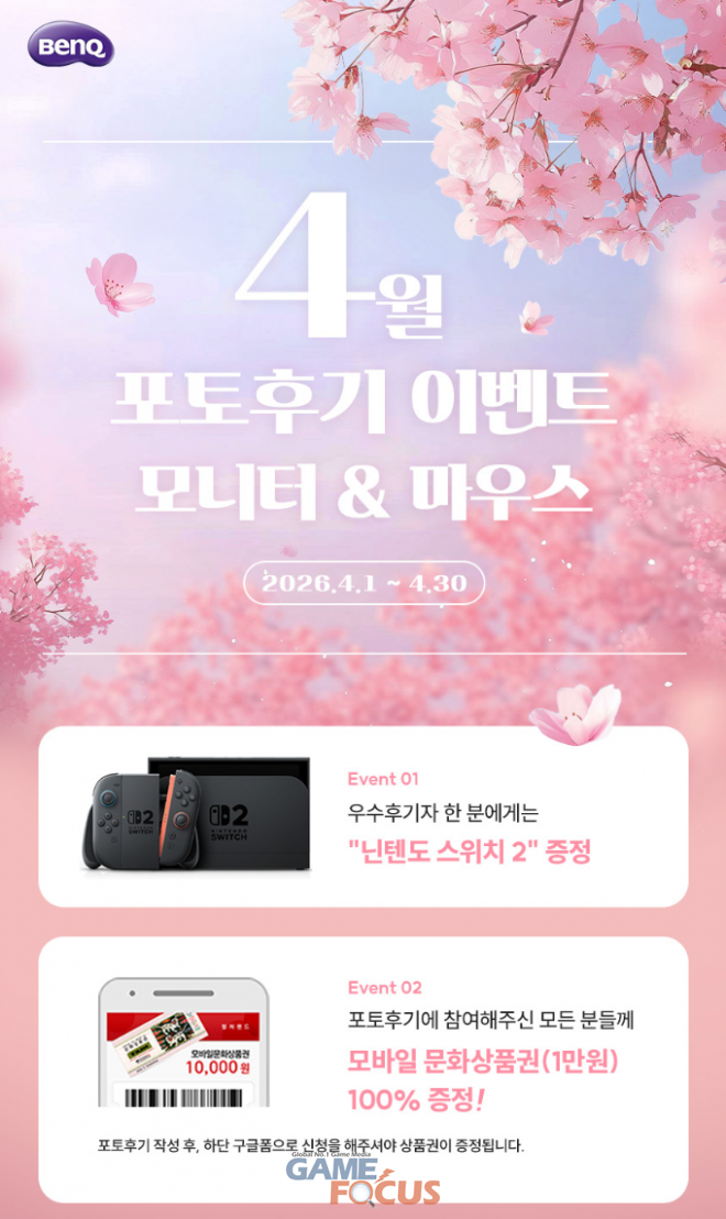 이번 이벤트는 4월 한 달 간 벤큐 모니터 또는 마우스를 구입하고 제품 사진이 담긴 후기를 작성한 뒤, 구글폼으로 신청한 모든 분들에게 모바일 문화상품권(1만원권)을 증정하고, 우수 후기자 한 명에게는 ‘닌텐도 스위치 2’를 추가로 증정하는 행사이다.