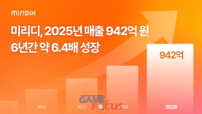 미리디는 2020년 매출 147억원 달성 후 21년 193억원, 22년 331억원, 23년 607억원, 24년 780억원, 25년 942억원으로 6년 연속 최대 매출을 갱신했다.