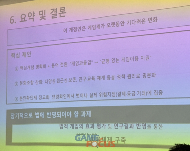 다만 개정안이 게임문화 진흥을 전면에 배치했음에도 불구하고, 실제 구조는 여전히 과몰입 예방 등 ‘보호 프레임’이 강하게 남아 있으며, 문화 진흥과 이용자 보호의 관계가 지원 중심이 아닌 통제 중심으로 이해될 가능성이 있음을 지적했다.