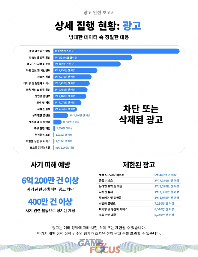 구글의 광고 안전 정책은 국내에서도 엄격하게 적용됐다. 2025년 한 해 동안 국내 총 1억 7,550만 건의 광고가 플랫폼에서 제거되었으며, 광고 정책을 위반한 32만 6천개의 광고주 계정이 정지됐다.