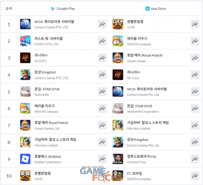 11위부터 20위 사이에는 '명일방주: 엔드필드'(12위), '서머너즈 워: 천공의 아레나'(13위), '트릭컬 리바이브'(16위) 등이 자리하고 있다.