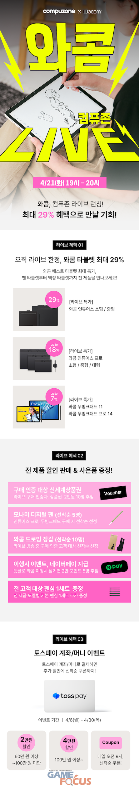 와콤코리아 관계자는 “디지털 창작을 시작하려는 입문자부터 고성능 장비가 필요한 전문가까지 모든 고객이 만족할 수 있도록 전 라인업에 걸친 파격적인 혜택을 준비했다”며, “컴퓨존 라이브를 통해 와콤의 독보적인 기술력을 합리적인 가격에 경험해 보길 바란다”고 전했다.