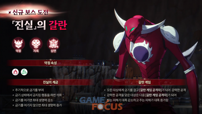 특히 이번 액트의 메인 빌런인 갈란은 신규 보스 도전 콘텐츠로 등장할 예정이다. 갈란은 주기적으로 금기를 부여하고 금기 상태에서 금지된 행동을 하면 석화 디버프를, 금기를 어기면 최대 생명력이 감소하고 반대로 금기를 어기지 않으면 최대 생명력이 증가한다.