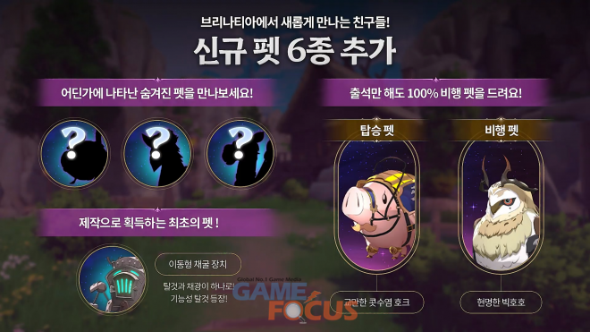 브리타니아에서 사용 가능한 펫 6종이 등장한다. 신규 펫은 포획, 제작, 출석 등을 통해 획득 가능하다.