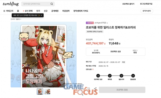 픽글(pickgeul)이 인기 일러스트레이터 '나나곰'과 협업한 드로잉 교육 프로젝트가 텀블벅 펀딩액 4억 원, 기존 목표의 80348%를 달성했다고 밝혔다. 이번 프로젝트는 1만 1천 명 이상의 후원자를 기록하며, 그림을 통해 자신의 취향을 공유하고자 하는 1020의 열기를 증명했다.