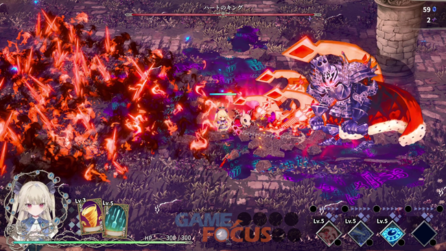 배틀 파트에서는 '죄'를 무기로 적을 쓰러뜨리고, 쓰러뜨린 적의 단말마를 통해 연출되는 가속 액션 및 트럼프 형식의 스킬 카드를 수집해 5장의 핸드로 '조합'을 만드는 포커식 빌드를 통해 전략성이 뛰어난 배틀을 즐길 수 있다.