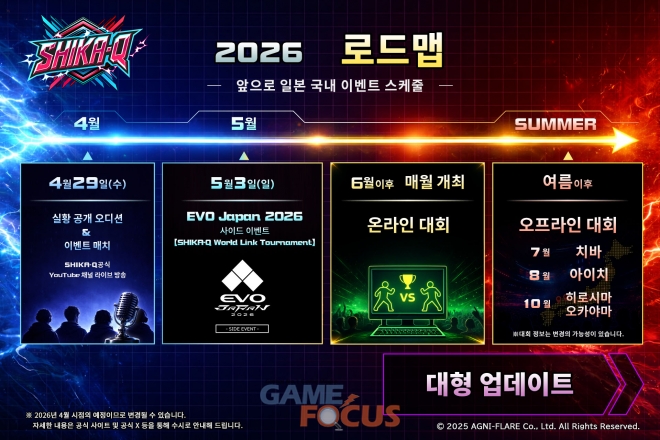 '시카큐'는 5월 3일 열리는 EVO 재팬 2026의 사이드 이벤트로 채택됐다. 아그니플레어는 이를 바탕으로 e스포츠 경기 환경을 확장할 계획이다.