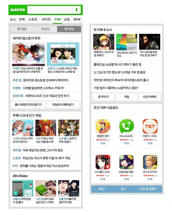 우선 네이버 모바일 메인 페이지에 앱/게임판을 신설해 이용자와 중소 앱 개발사간 접점을 확대한다. 앱/게임판의 우수앱 추천 코너, 양질의 리뷰 등을 통해 다양한 앱을 이용자에게 간편하게 소개할 예정이다.