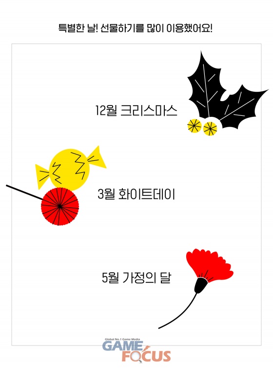 월간 거래액 추이를 살펴보면 카카오톡 선물하기가 특별한 날 선물할 때 찾는 대표 모바일 커머스 플랫폼으로 자리매김했음을 확인할 수 있다. 발렌타인데이, 화이트데이, 빼빼로데이, 수능, 크리스마스, 설날, 추석 등에 거래액이 눈에 띄게 높게 나타난 것. 모바일 교환권뿐만 아니라, 받는 사람의 주소를 몰라도 쉽게 선물할 수 있는 배송상품, 자체 기획/구성한 '옐로우 기프트' 등을 선물할 수 있어 이용자들의 호응을 얻은 것으로 분석된다.