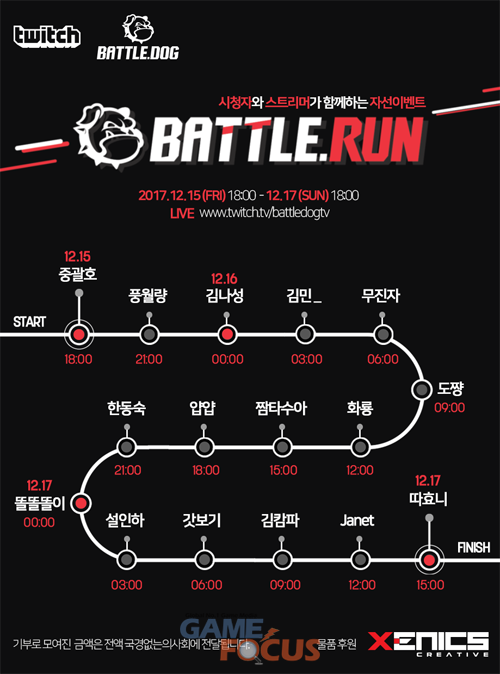 스트리밍툴 서비스인 트윕(Twip)과 e스포츠 플랫폼 배틀독을 운영하는 이제이엔이 처음으로 기획한 '기부 이벤트' 배틀런에서는 최근 온라인 방송에서 인기를 모은 일명 '항아리게임' 'Getting Over It'과 더불어 총 16종의 게임 플레이가 이어진다. 각 게임들은 스트리머들이 여러가지 미션을 수행하고 시청자들과 함께 후원금을 모금하는 형태로 진행되며, 모든 이벤트는 트위치의 배틀독TV 전용 채널을 통해 생중계된다.