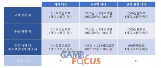 예를 들면, 고객은 비트 코인 마켓에서 1비트코인으로 A코인 1개를 구매하였고, 당시 비트코인 가격인 1,000만원을 기준으로 총 1,000만원 어치의 A코인을 샀다고 생각했는데, 거래 내역에는 1비트코인으로 A코인 1개를 구매한 부분은 동일하나 체결~매수평단가 계산 시점 간에 변동된 A코인 가격인 0.95 비트코인 기준으로 950만원 어치의 A코인을 구매했다고 기록되어 오해가 발생한 것입니다. (하단 표 참고)