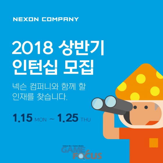 ㈜넥슨(대표 박지원)은 15일부터 25일까지 2018년도 상반기 인턴사원을 공개 모집한다고 밝혔다.